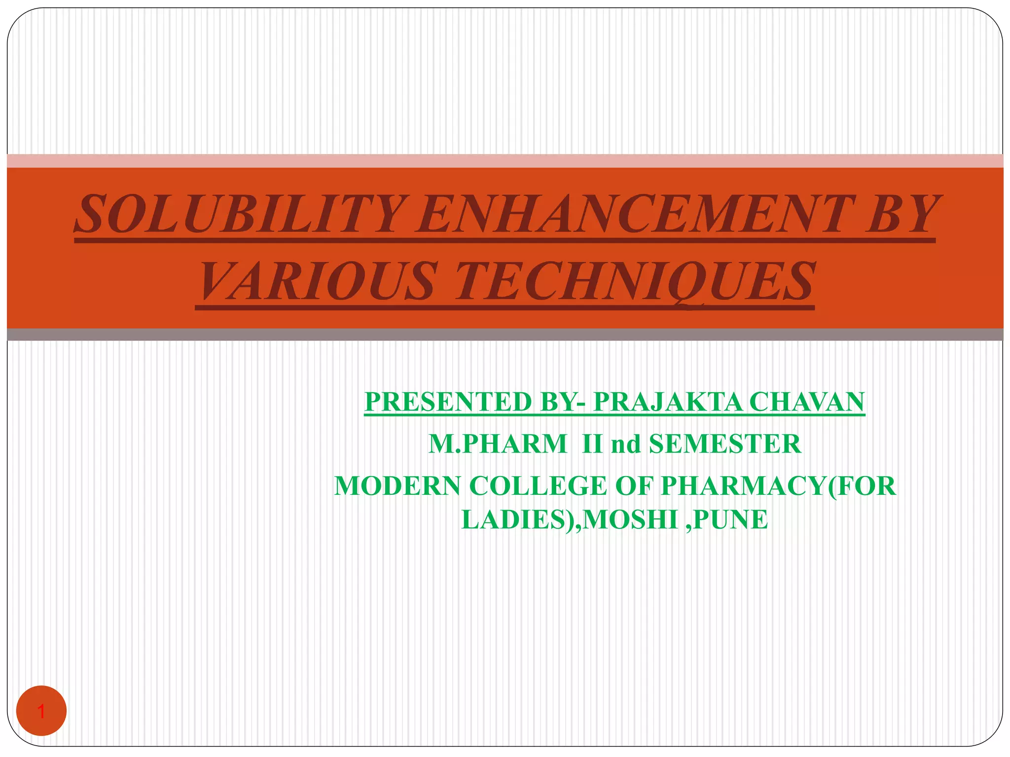 This document discusses various techniques for enhancing the solubility of drugs, including particle size reduction, hydrotropy, cosolvency, solubilization by surfactants, solid dispersions, pH adjustment, high pressure homogenization, supercritical fluid recrystallization, sonocrystallization, complexation, spray drying, inclusion complex formation, liquisolid technique, microemulsions, and self-emulsifying drug delivery systems. Particle size reduction techniques like micronization and nanosuspensions increase surface area to enhance dissolution rate and solubility. Other techniques utilize excipients like surfactants, cosolvents, and polymers to solubilize drugs.