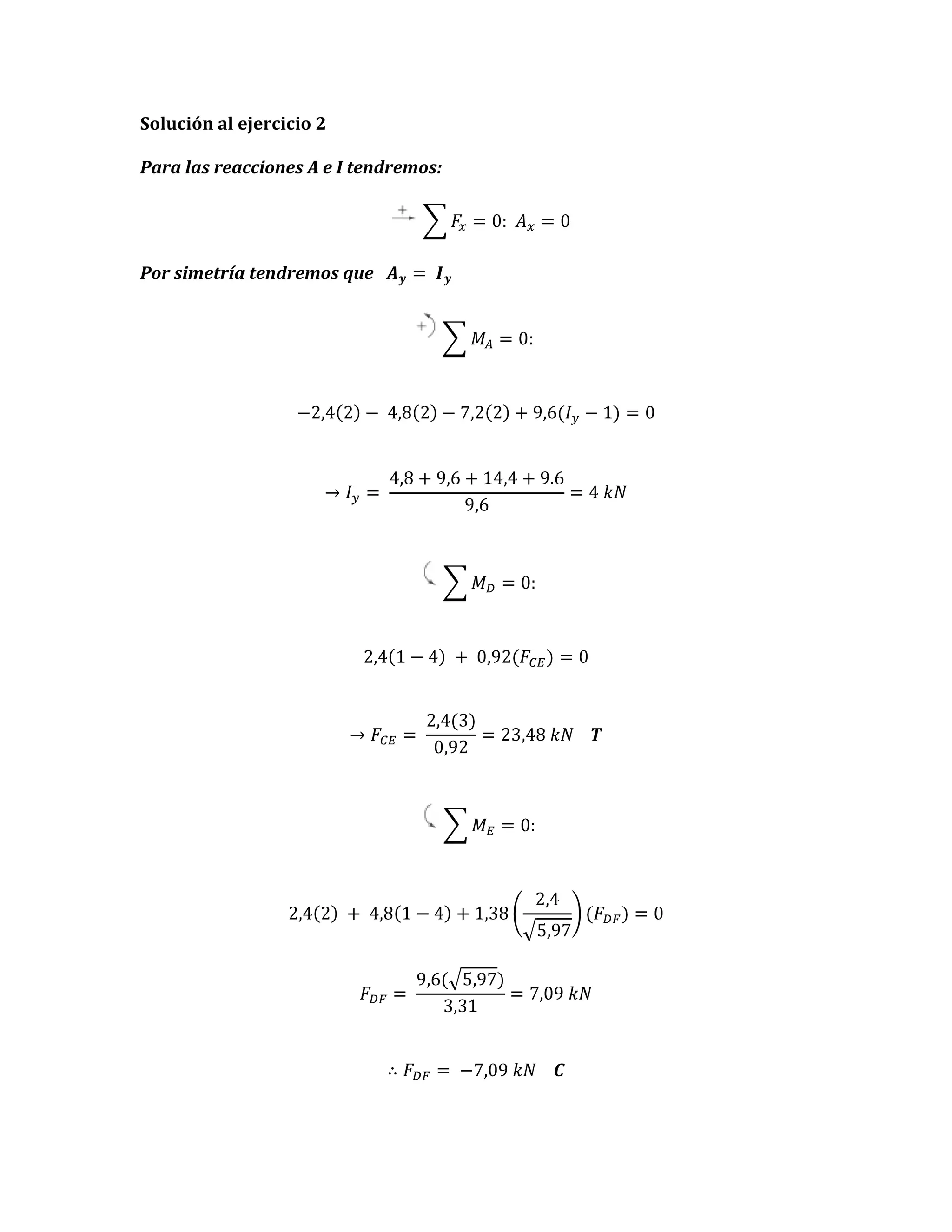 This document contains solutions to exercises involving free body diagrams and static equilibrium calculations for levers and trusses. The first part shows the free body diagram and calculations for a lever BCD, determining the force of 449 N and angle of 32.3 degrees. The second part shows the free body diagrams at each joint (A, B, C) of a truss and the resulting force calculations.