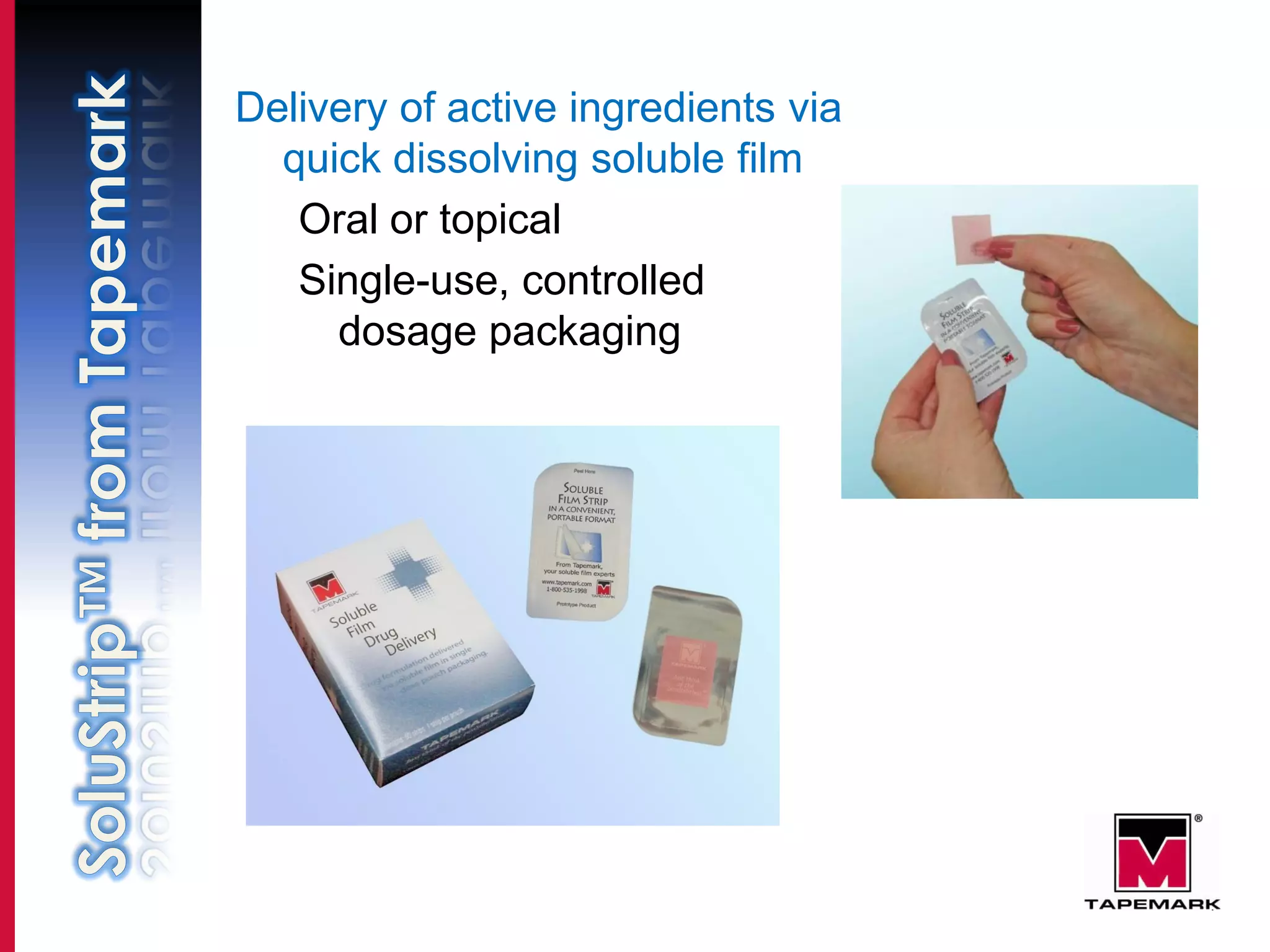 This document discusses using soluble film to deliver active ingredients through quick dissolving strips for oral or topical administration. It notes some key applications like tooth whitening, cough/cold relief, vitamins, and homeopathic remedies. It highlights benefits like ease of use, improved compliance, and diverse routes of entry. It also discusses partnerships with film suppliers, over 10 years of experience in film development and packaging, and regulatory compliance with FDA, EU, Japan, Australia, and other international standards.