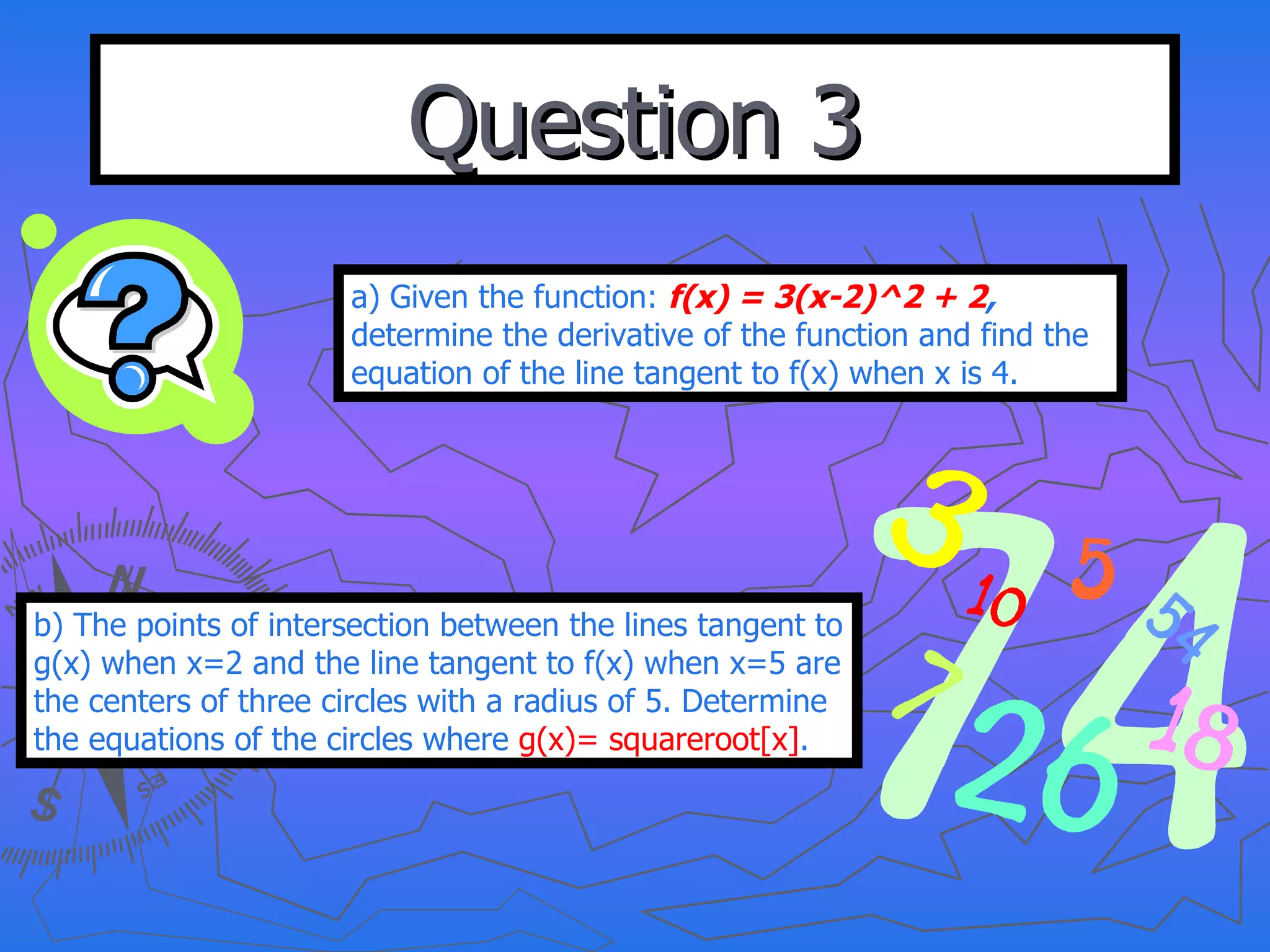 The document provides the steps to solve a multi-part calculus problem. It involves finding the derivative of two functions, determining the equations of tangent lines to those functions at given points, finding the intersection points of those tangent lines, and using those intersection points to write the equations of three circles with a radius of 5.