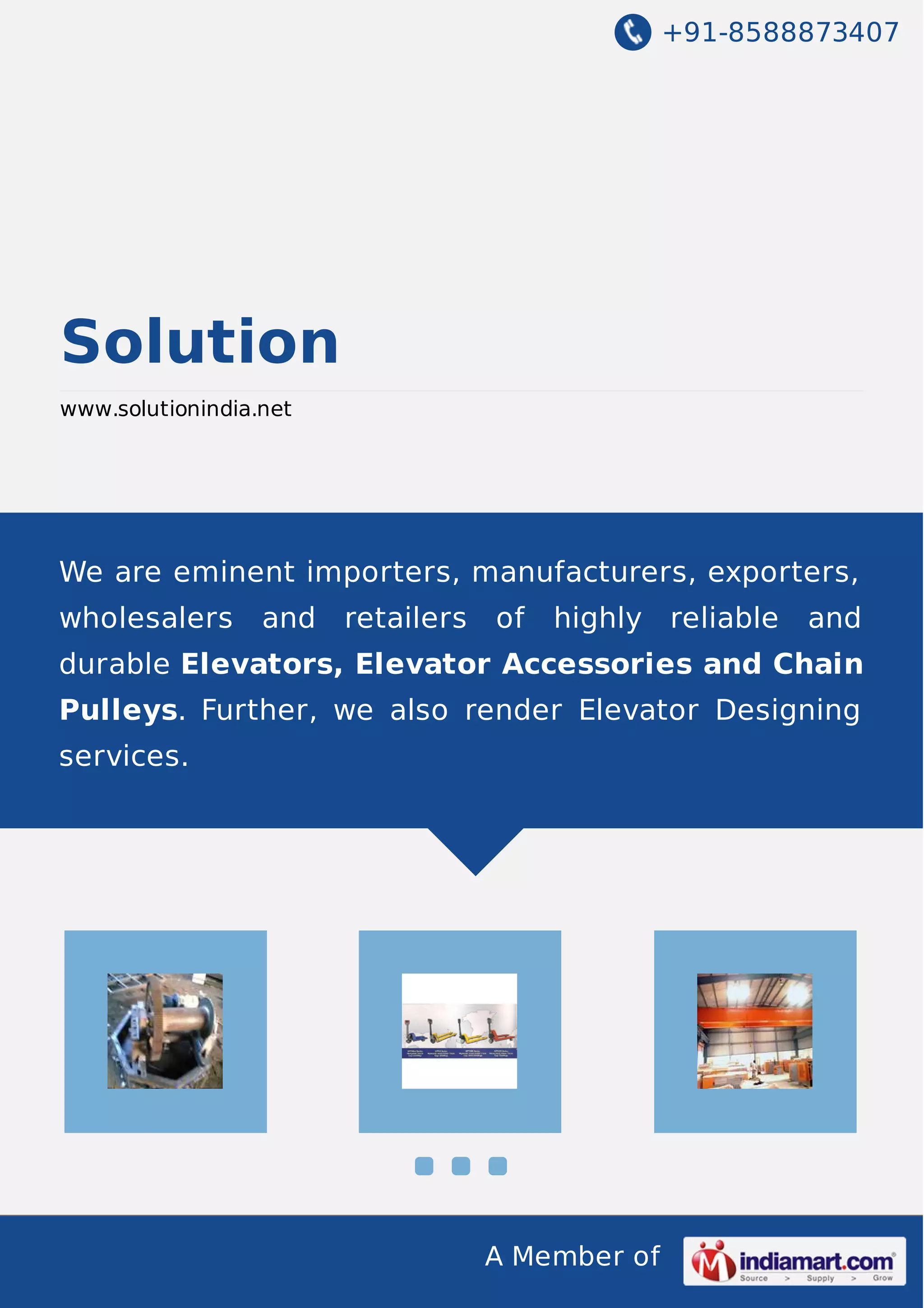 Solution, established in 2004, is a prominent manufacturer and exporter of elevators, cranes, and lifting equipment based in Hyderabad, India. The company prides itself on high-quality products and services, supported by a robust R&D department and plans for expansion with a new manufacturing unit. Their extensive product offerings and joint ventures with international partners highlight their growth and commitment to customer satisfaction.