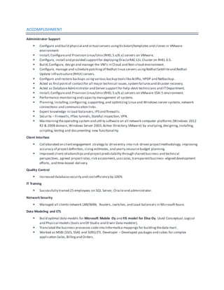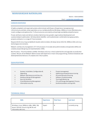 This document provides a summary of Manikandan Natarajan's career qualifications and experience. He has over 8 years of experience as a systems administrator managing server infrastructures across multiple platforms including Windows, VMWare, and Linux. He is skilled in system installation, configuration, upgrading, network maintenance, security, database design and management, project management, performance tuning, and disaster recovery planning. His technical skills include expertise in Windows, Linux, VMWare, SQL Server 2014 R2, Oracle11g, and he is currently using these skills. He provides tier 3 support and has experience in back-end programming, relational databases, and complex critical system development and maintenance.