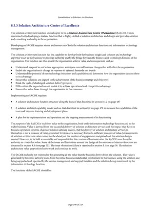 The document discusses the establishment and functioning of a Solution Architecture Centre of Excellence (SACoE), which aims to enhance an organization's solution architecture capabilities and provide leadership in solution and consulting. It outlines the core functions, principles, and necessary resources for developing a mature SACoE, emphasizing the importance of alignment with business strategy, technology advancements, and value generation throughout solution delivery. Additionally, the document highlights maturity models and frameworks for assessing the capability and knowledge of solution architecture teams.