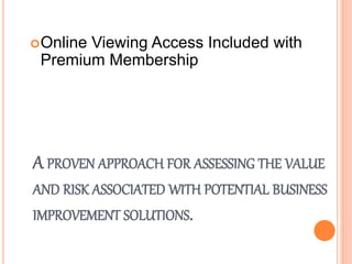 The document outlines a proven solution assessment method for evaluating potential business improvement initiatives, emphasizing its adaptability and ease of use. It serves as an objective tool to analyze business performance issues after a current state analysis is completed. Access to the method is available online for premium members, as part of a comprehensive business analysis toolkit.