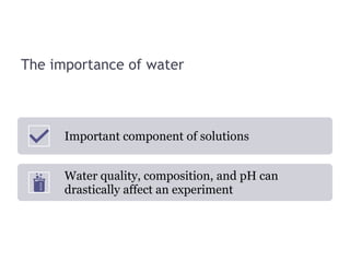 The document provides detailed guidelines on the appropriate types of water for laboratory experiments and the definitions and terminology related to solutions, such as solvents and solutes. It explains how to prepare solutions with specific concentrations, including molar and normal solutions, and discusses dilution calculations and safety precautions when handling strong acids and bases. Practice problems are included to reinforce the concepts covered.