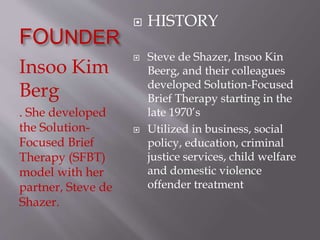 Insoo Kim Berg founded Solution-Focused Brief Therapy (SFBT) with her partner Steve de Shazer in the late 1970s. SFBT focuses on clients' strengths and resources rather than problems, believes clients have the ability to resolve their own concerns, and aims to identify solutions through asking questions instead of providing advice. It has been utilized in various social services fields and is based on the principles that small changes can lead to big differences, the future is negotiable, and the solution is not always directly related to the defined problem.
