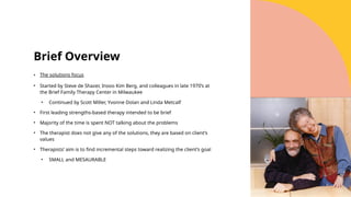 • Started by Steve de Shazer, Insoo Kim Berg, and colleagues in late 1970’s at