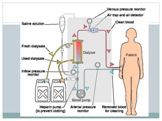This document discusses different types of solutions and concentration expressions. It defines solution as a mixture of solute and solvent. Normal solution is defined as grams of solute dissolved in 1000 mL of solvent. Molar solution is grams of solute's molecular weight dissolved in 1000 mL. Percent solution expresses the ratio of solute to final solution weight by weight, weight by volume, or volume by volume. Osmosis and diffusion are distinguished, with osmosis being solvent movement through a semipermeable membrane towards higher solute concentration and diffusion being solute movement from higher to lower concentration. Dialysis is introduced as a process for removing waste and excess water from the blood, used as kidney replacement in failure.