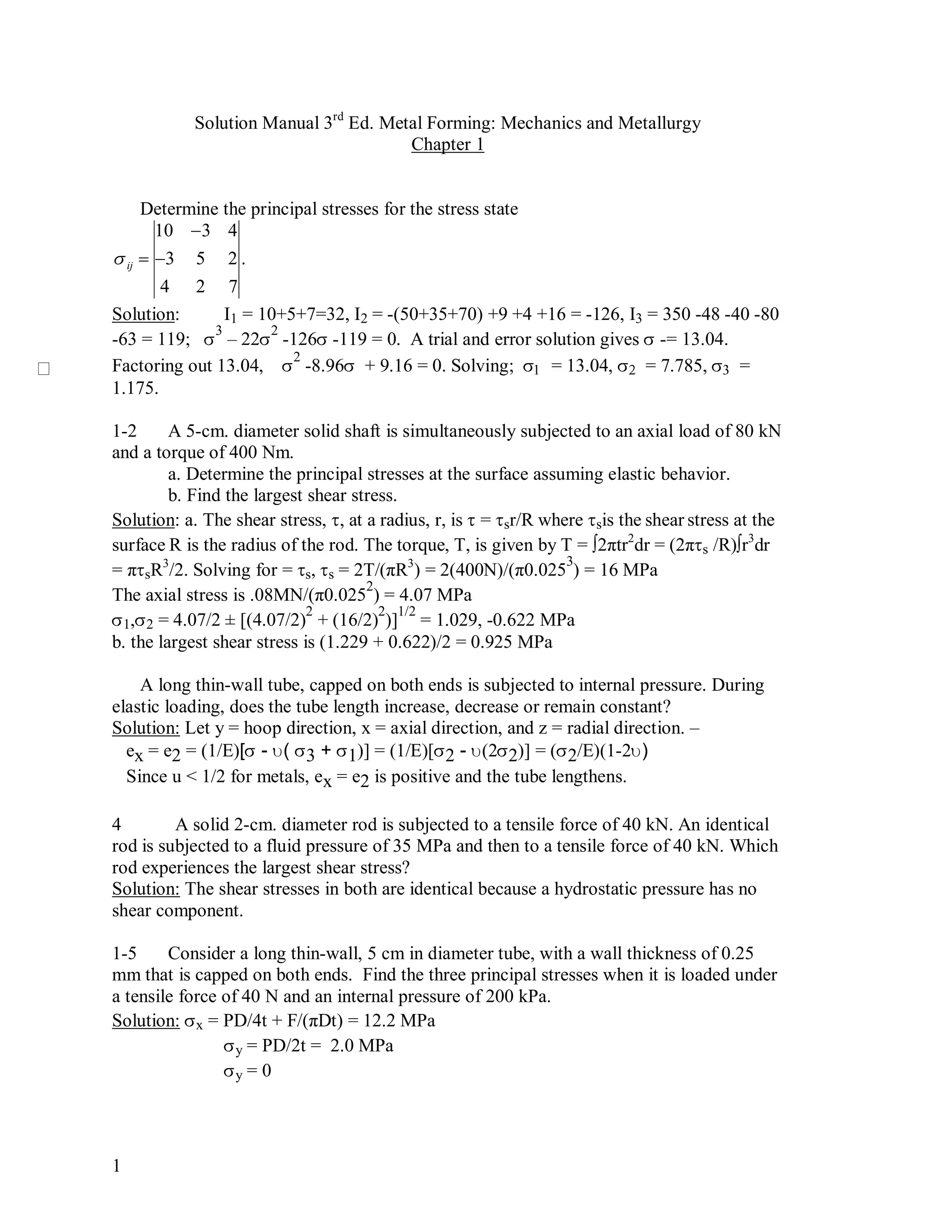 The document provides solutions to example problems in a chapter on metal forming mechanics and metallurgy. It determines principal stresses for a given stress state. It then solves additional examples involving determining stresses in rods, tubes, and sheets under various loading conditions. The solutions make use of stress-strain relationships and failure criteria like Tresca and von Mises to determine stresses and strains.