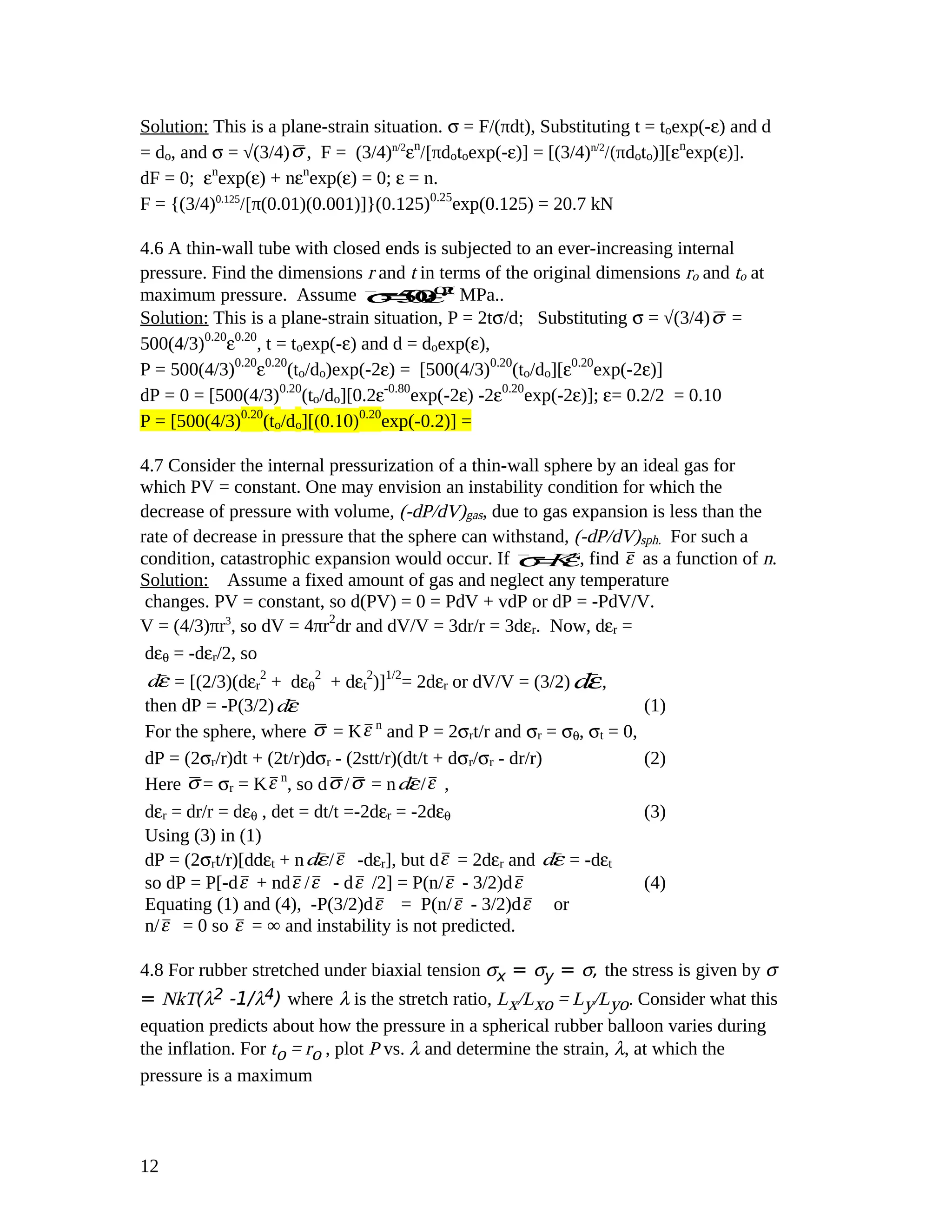 2) Other problems determine instability strain and pressure for thin-walled tubes undergoing internal pressurization. Expressions are derived for instability strain in terms of the stress exponent n.