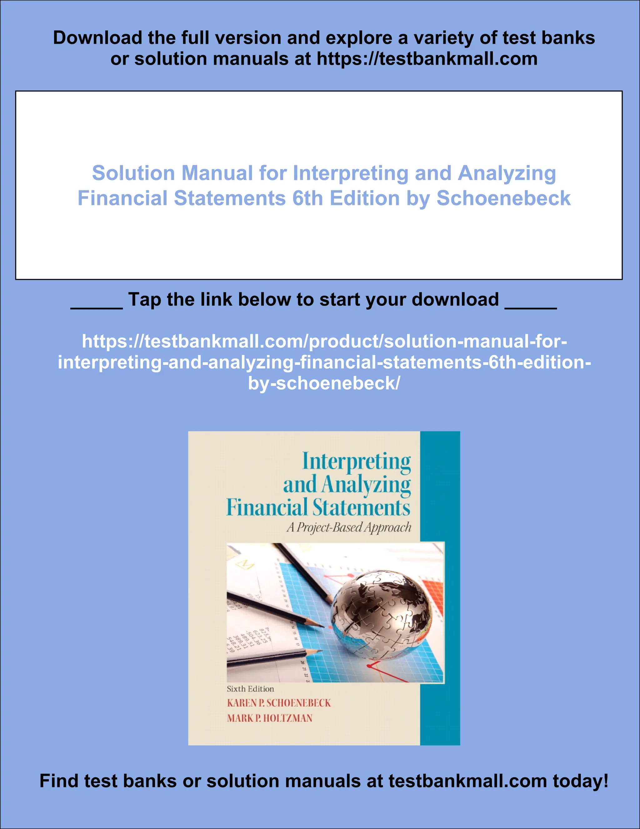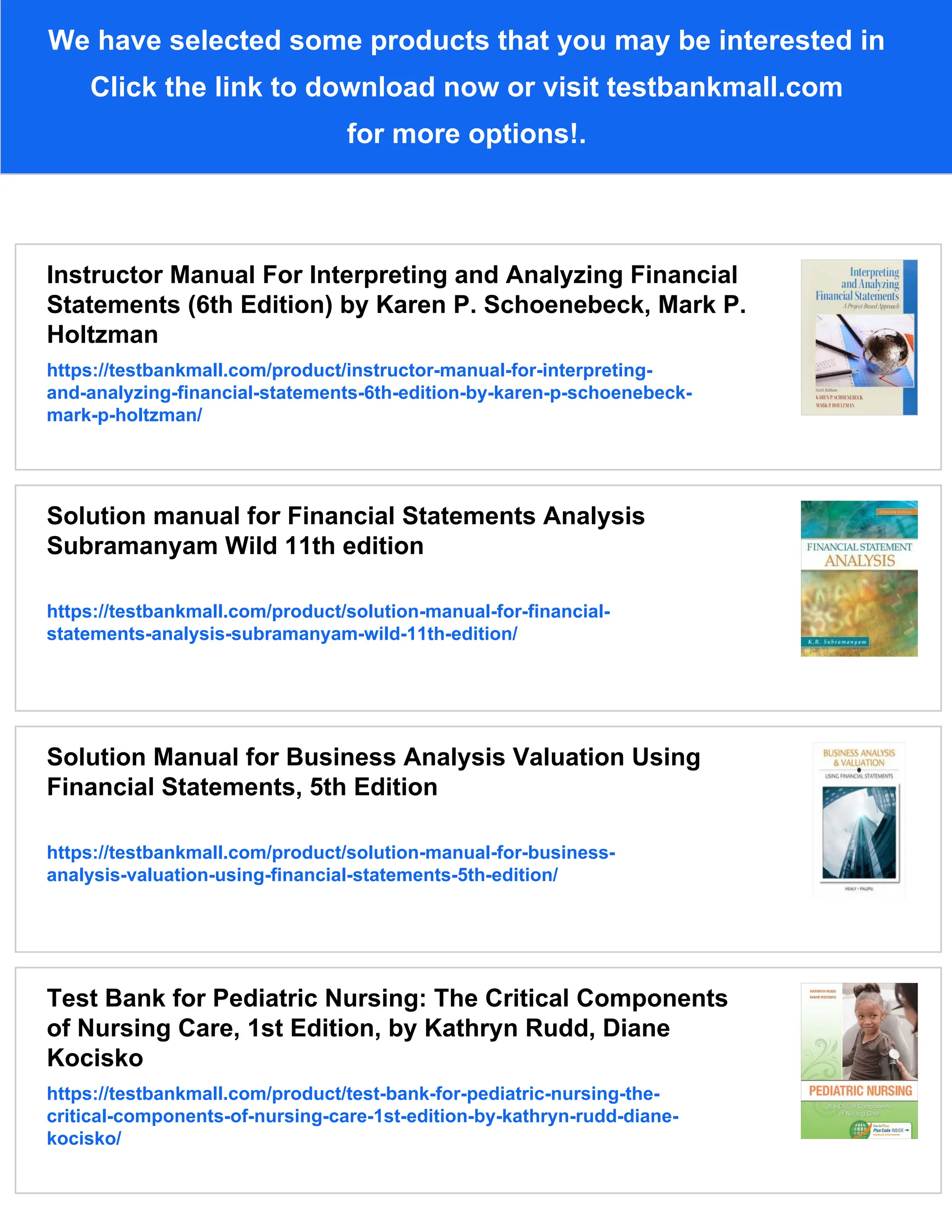 We have selectedsome products that you may be interested in Click the link to download now or visit testbankmall.com for more options!. Instructor Manual For Interpreting and Analyzing Financial Statements (6th Edition) by Karen P. Schoenebeck, Mark P. Holtzman https://testbankmall.com/product/instructor-manual-for-interpreting- and-analyzing-financial-statements-6th-edition-by-karen-p-schoenebeck- mark-p-holtzman/ Solution manual for Financial Statements Analysis Subramanyam Wild 11th edition https://testbankmall.com/product/solution-manual-for-financial- statements-analysis-subramanyam-wild-11th-edition/ Solution Manual for Business Analysis Valuation Using Financial Statements, 5th Edition https://testbankmall.com/product/solution-manual-for-business- analysis-valuation-using-financial-statements-5th-edition/ Test Bank for Pediatric Nursing: The Critical Components of Nursing Care, 1st Edition, by Kathryn Rudd, Diane Kocisko https://testbankmall.com/product/test-bank-for-pediatric-nursing-the- critical-components-of-nursing-care-1st-edition-by-kathryn-rudd-diane- kocisko/