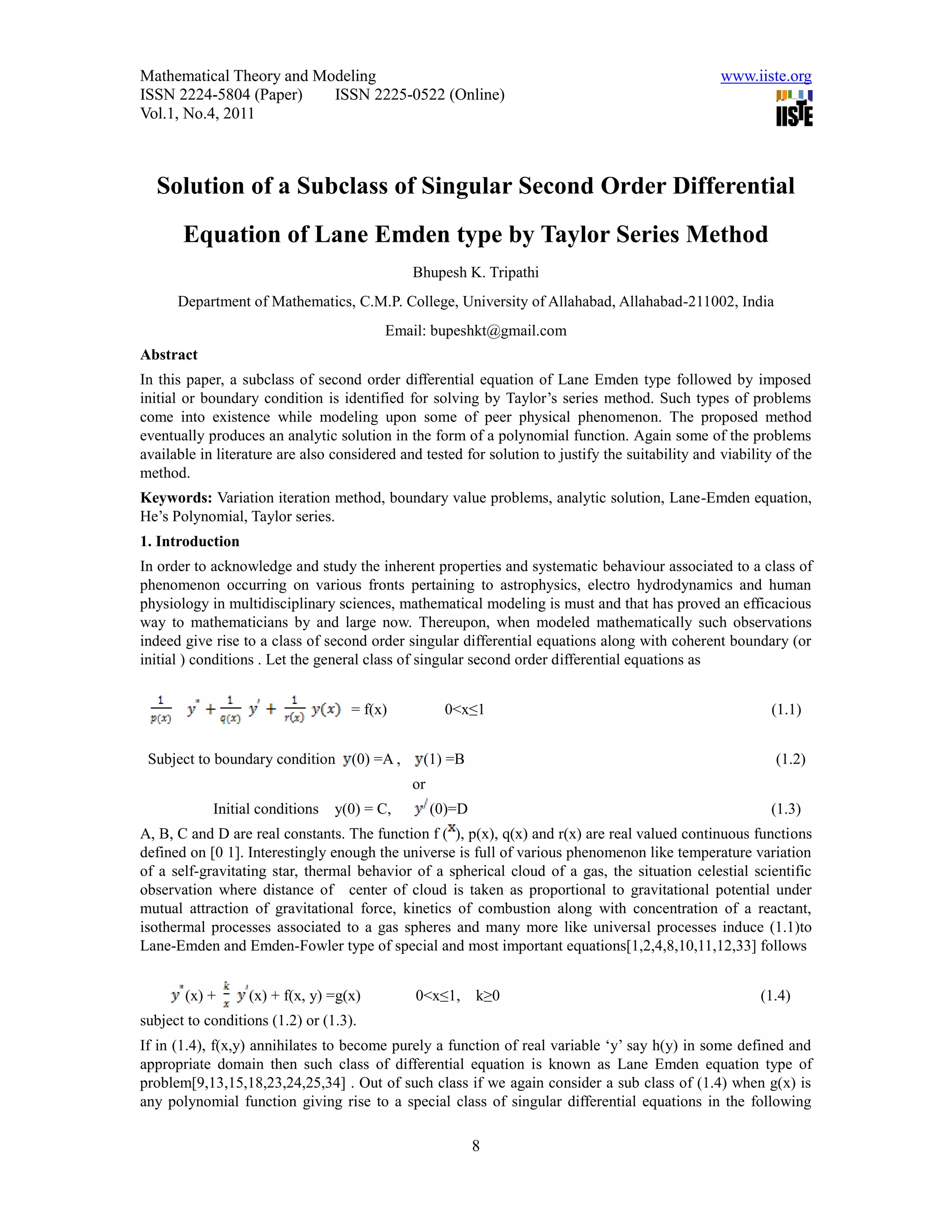 This document discusses using the Taylor series method to solve a subclass of singular second order differential equations of Lane-Emden type.