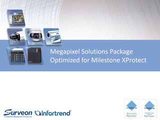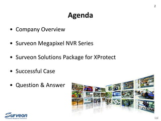 This document provides an overview of Surveon's megapixel solutions package optimized for Milestone XProtect video management software. It discusses Surveon's NVR series including the EMR2000, EMR5000, EMR8000 and EMR9000 models. Performance test results are shown for configurations ranging from 8 to 64 channels. Larger advanced projects using iSCSI storage solutions supporting up to 3000 channels are also described. The document aims to demonstrate how Surveon's solutions provide reliable, scalable and cost effective video surveillance systems.