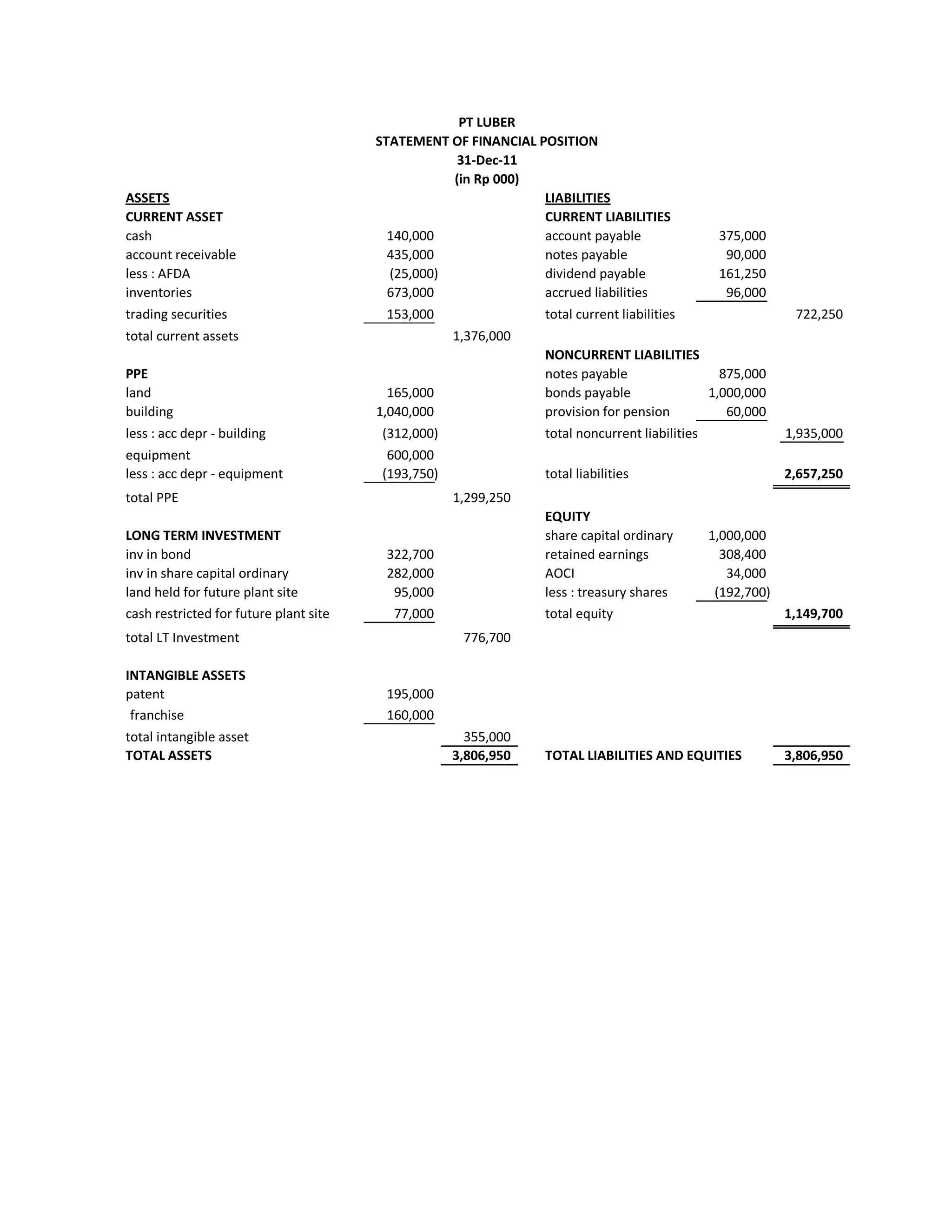 The statement of financial position of PT Luber shows total assets of Rp3.8 billion consisting of current assets, property and equipment, long term investments and intangible assets. Total liabilities are Rp2.7 billion comprising current and non-current liabilities. Total equity is Rp1.1 billion.
