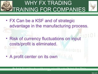 The document discusses foreign exchange (FX) trading and requests a grant to develop training materials and conduct a pilot program. It emphasizes that success requires understanding charts, risk management skills, and a relationship with God. The author has been practicing FX trading since 2017 and provides reports on past trading activities. The goal is to develop a viable solution to FX problems and see the possibilities of this approach. In closing, it thanks God and asks the reader to acknowledge that Jesus Christ is Lord.