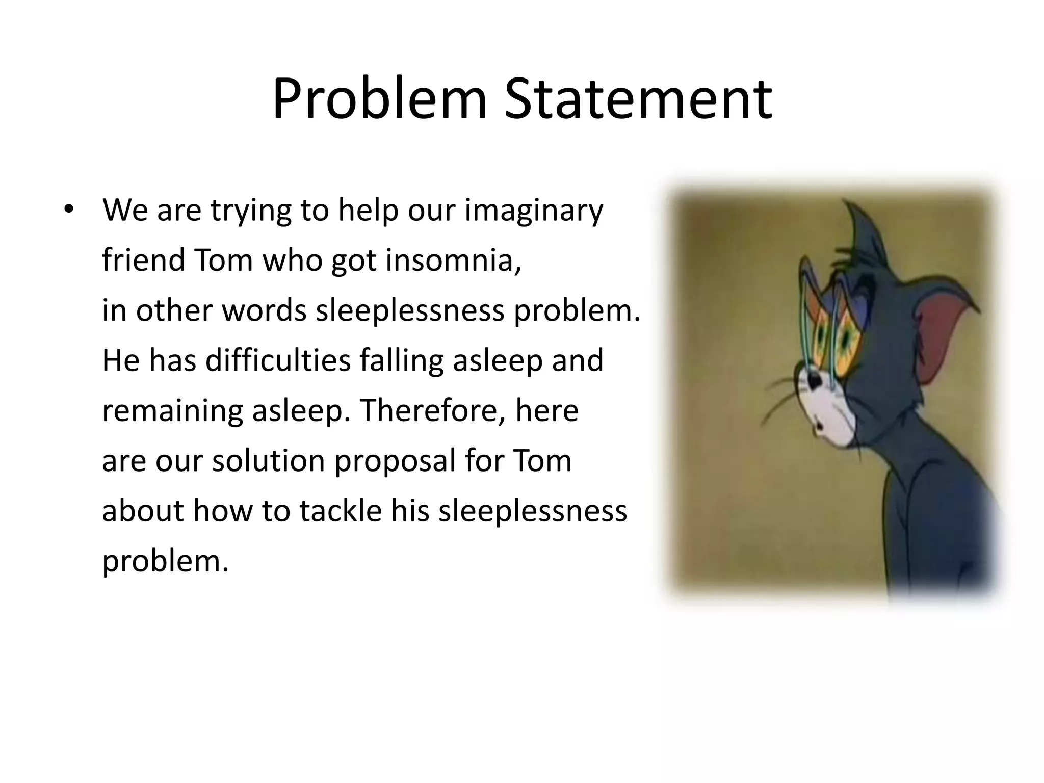The document provides a 100-point solution proposal for an imaginary friend named Tom who suffers from insomnia or sleeplessness. The proposals include recommendations like taking a warm bath before bed, avoiding screens before sleeping, keeping a regular sleep schedule, exercising during the day but not right before bed, and using relaxation techniques like deep breathing and muscle relaxation.