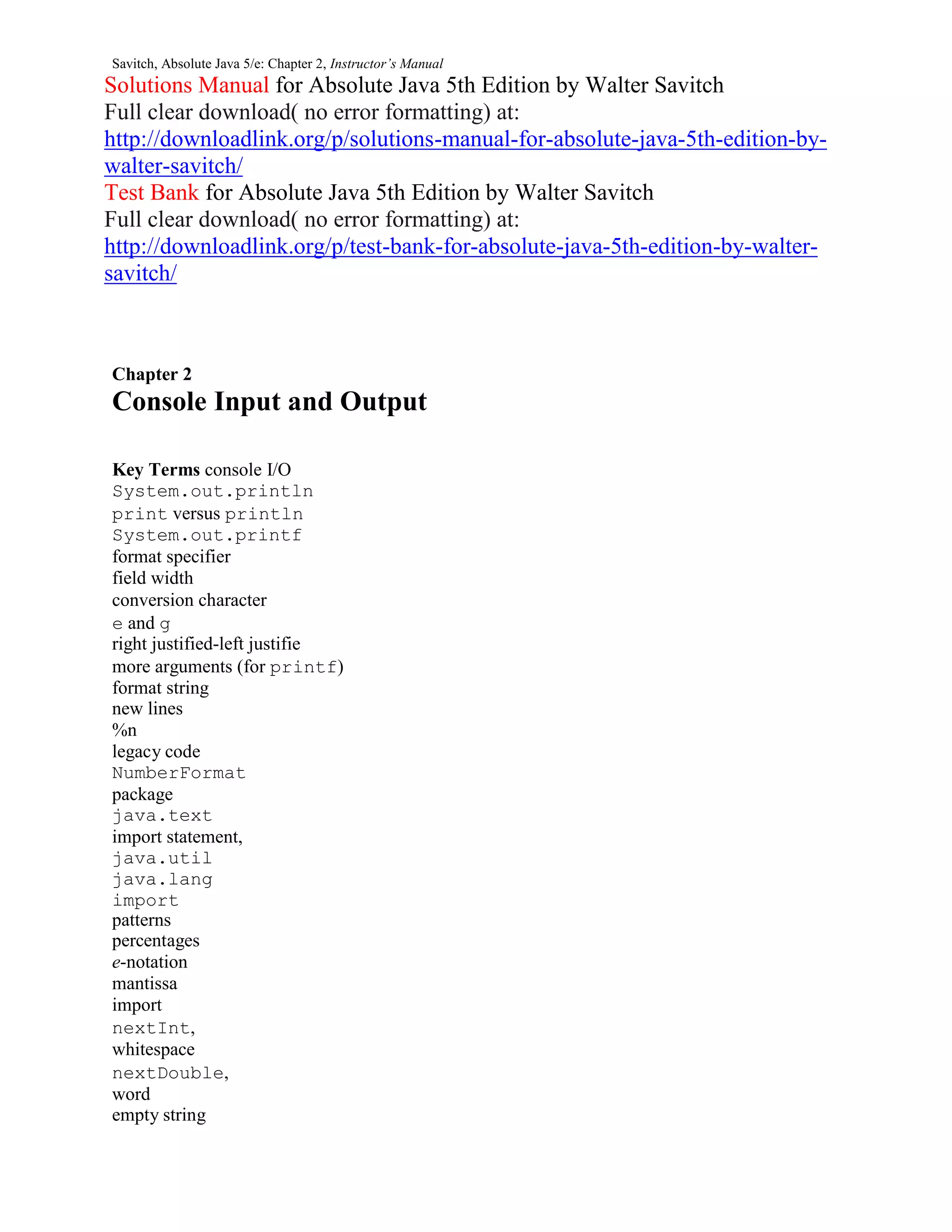 The document is an instructor's manual for Chapter 2 of 'Absolute Java 5th Edition' by Walter Savitch, covering console input and output in Java. It introduces the Scanner class for input, discusses formatting output using System.out.printf and NumberFormat for currency, and highlights key concepts like prompt input practices and pitfalls of input handling. Additionally, it includes programming examples and projects that utilize the concepts taught in the chapter.