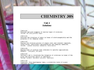 This document provides an overview of solutions and key solution concepts in chemistry. It defines a solution as a homogeneous mixture of two or more substances distributed at the molecular or ionic level. The main components of a solution are the solute, which is the dissolved substance, and the solvent, which does the dissolving and is present in greater quantity. The document discusses different types of solutions, factors that influence solubility such as polarity and temperature, and phenomena involving solutions like boiling point elevation and freezing point depression.