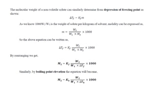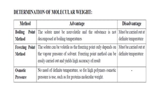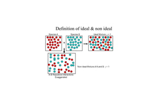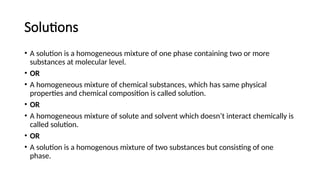 The document details the characteristics, types, and properties of solutions in physical pharmacy, explaining key concepts such as solute, solvent, and phases. It covers the definitions of various solution types like true solutions, colloidal dispersions, and coarse dispersions, including their colligative properties and concentration expressions. Additionally, it differentiates between ideal and real solutions, elaborating on Raoult's law and the effects of solute concentration on boiling and melting points.
