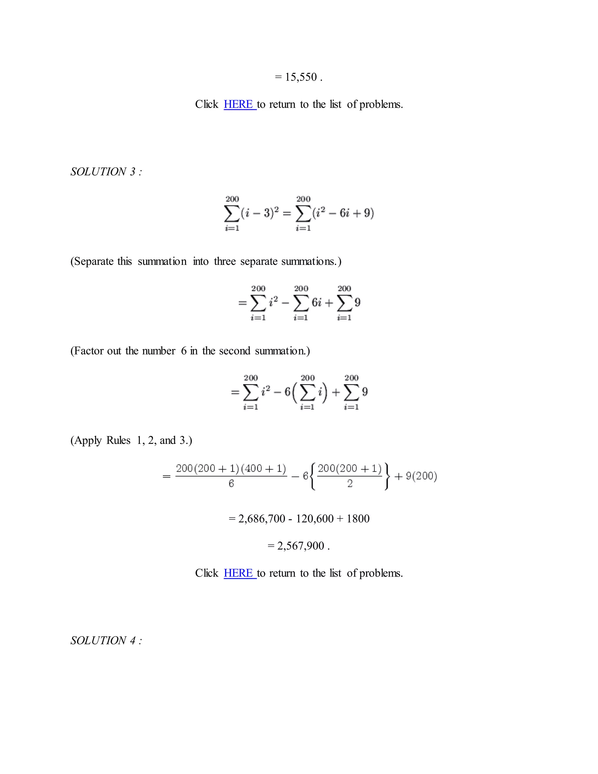 The document provides 14 solutions to algebra summation problems. Each solution shows the step-by-step working to evaluate summations using summation rules and properties like grouping like terms, factoring, and treating summations as telescoping sums where consecutive terms cancel out. Examples include evaluating summations of increasing powers and fractions that are decomposed into partial fractions to find a closed form solution.