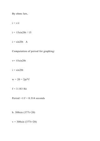 The document provides detailed calculations and sinusoidal expressions for current and voltage in various circuits based on given parameters, including various values of resistance, inductance, and capacitance. It covers methods for determining inductive and capacitive reactance, frequency, and converting complex numbers between rectangular and polar forms. The document also includes graphing instructions and specific numerical examples for illustrating the calculations.