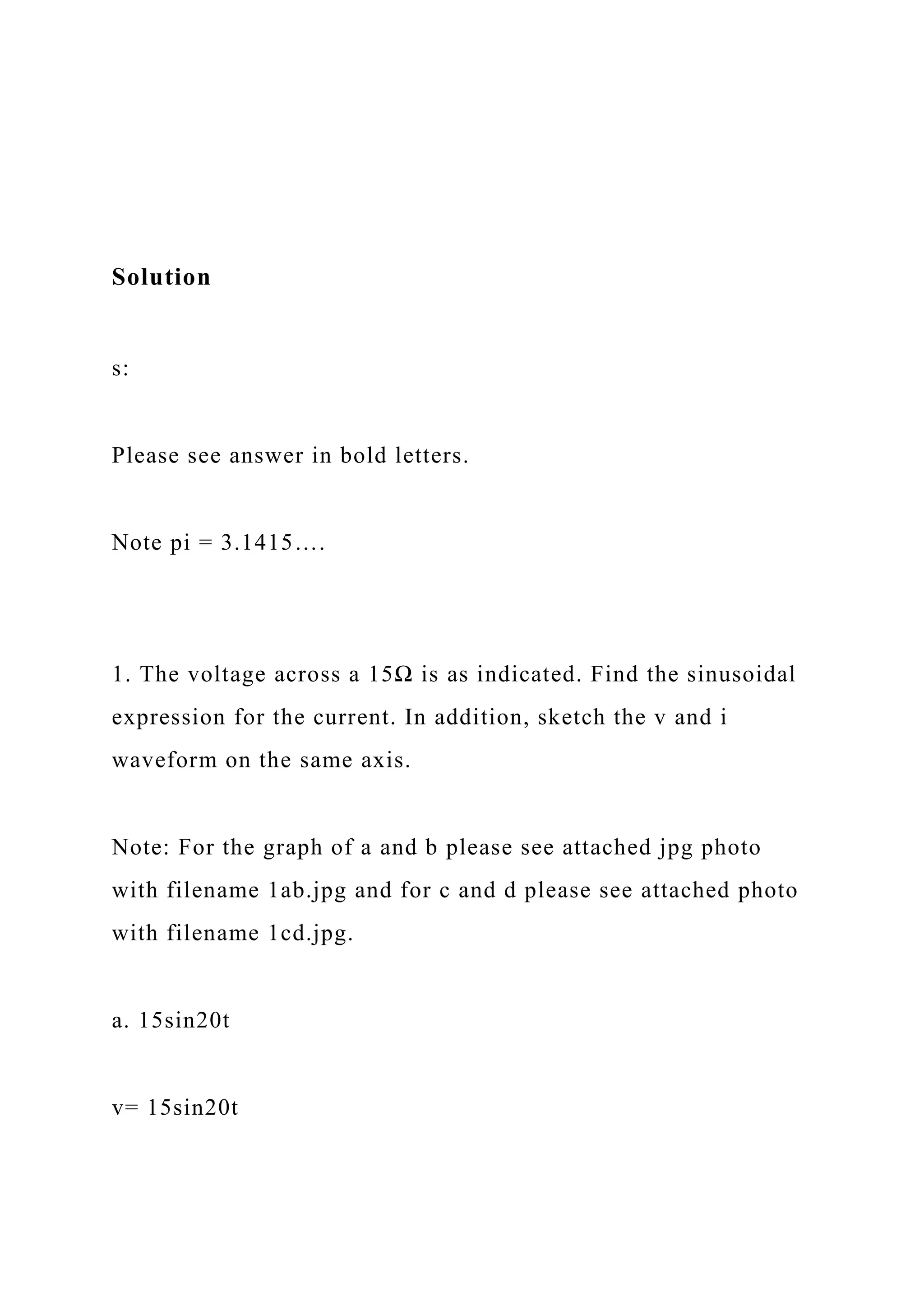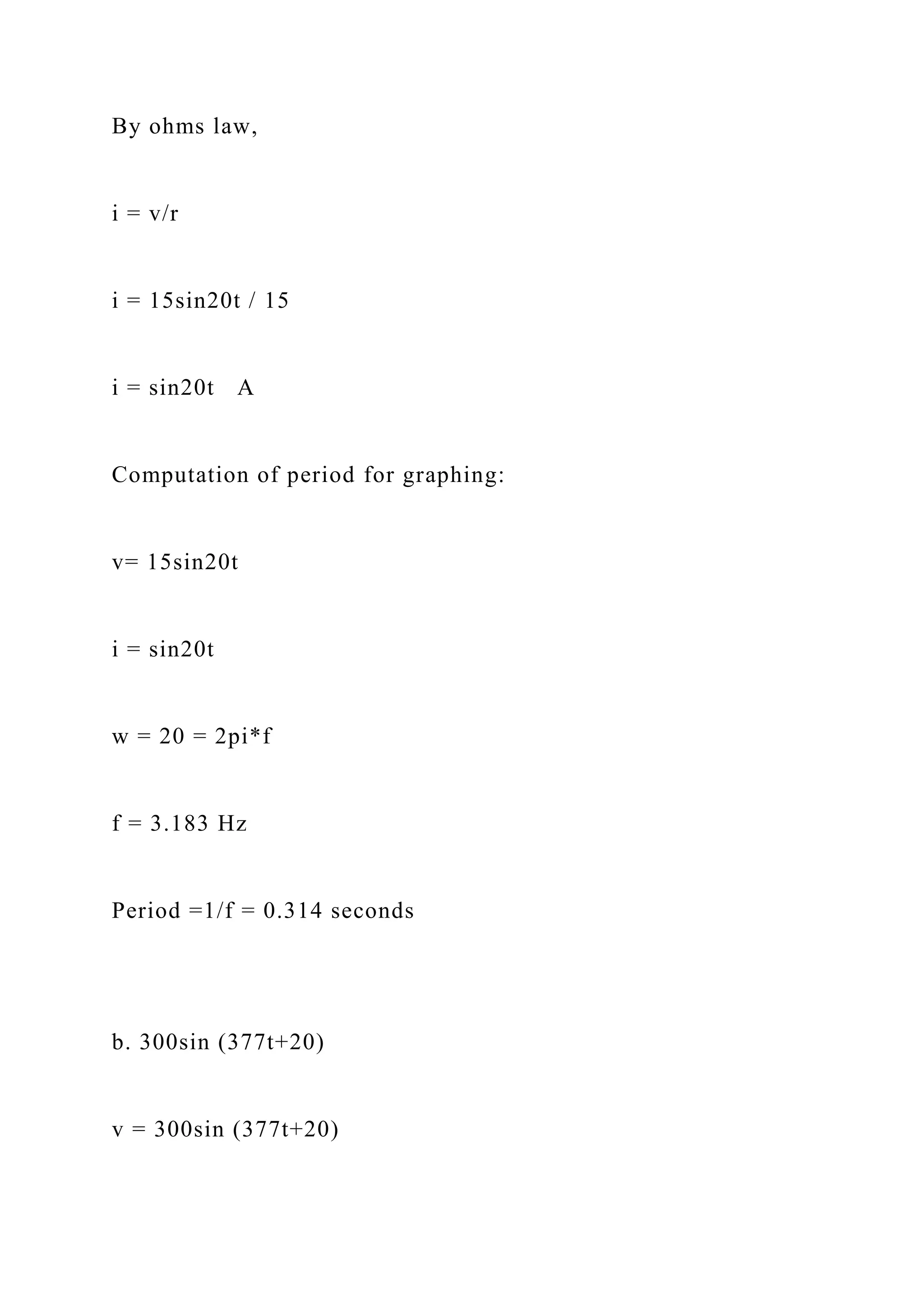 The document provides detailed calculations and sinusoidal expressions for current and voltage in various circuits based on given parameters, including various values of resistance, inductance, and capacitance. It covers methods for determining inductive and capacitive reactance, frequency, and converting complex numbers between rectangular and polar forms. The document also includes graphing instructions and specific numerical examples for illustrating the calculations.