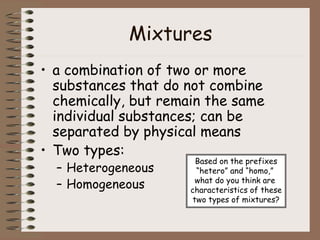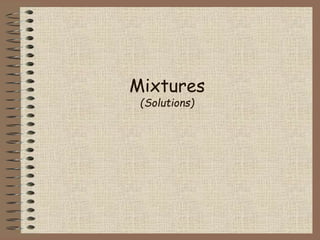 Mixtures can be either heterogeneous or homogeneous. Heterogeneous mixtures have visibly distinct components that can be separated physically, like a trail mix. Homogeneous mixtures appear uniform throughout and cannot be separated into distinct components using physical means, like salt water solutions. Solutions are a type of homogeneous mixture where a solute dissolves uniformly in a solvent. The concentration of a solute affects properties of the solvent like freezing point and boiling point. Acids donate hydrogen ions in water and turn litmus paper red, while bases accept hydrogen ions and turn litmus paper blue. A neutralization reaction occurs when an acid and base react and produce water and a salt. The pH scale measures acidity from 0-7 or basicity from