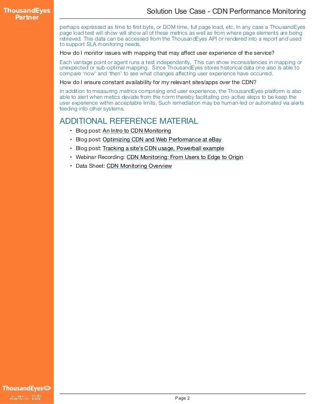 This document discusses using ThousandEyes to monitor CDN performance. CDNs improve user experience by caching content on distributed servers close to users. ThousandEyes agents can monitor the network paths between servers and users to provide insight into potential issues. The document provides an example of how eBay uses ThousandEyes to monitor key infrastructure like DNS, load balancers, routing and their CDNs to complement real user monitoring.