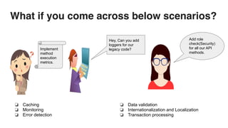 This document discusses cross-cutting concerns in programming and introduces aspect-oriented programming (AOP) as a solution to improve modularity by encapsulating these concerns into reusable aspects. It outlines the importance of addressing issues like scattered code and maintainability, as well as the key terminology and various types of advice used in AOP, particularly within Java frameworks like Spring. The document highlights the benefits of AOP such as clean code isolation, simplified maintenance, and improved code structure.