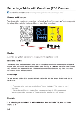 This document provides examples and explanations of percentage calculations and tricks. It begins by defining key terms like numbers, ratios, fractions, and percentages. It then provides 21 example problems demonstrating how to use percentages to solve word problems involving topics like profit/loss, population changes, exam scores, and more. The examples illustrate common percentage calculation methods and tricks like breaking percentages into fractions. The document emphasizes learning fractions and tables to help solve percentage problems more quickly.