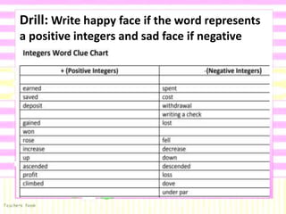 This document provides examples of solving routine and non-routine integer addition problems using appropriate strategies and tools. It includes examples of performing integer addition operations, solving word problems involving changes in temperature and position, and using a 4-step problem solving plan. The document is intended to help students practice skills in adding integers and solving related math word problems.