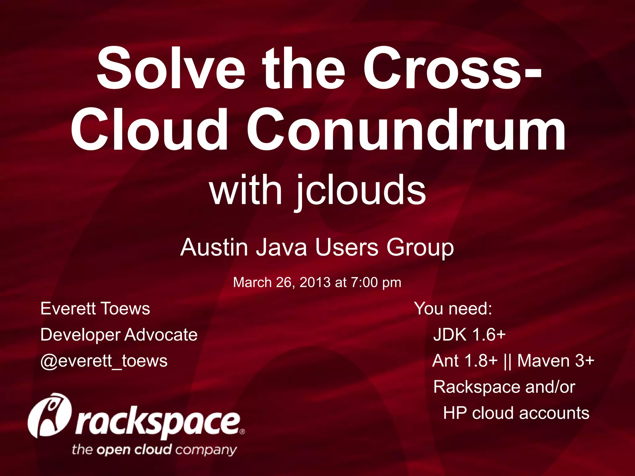 This document summarizes a presentation by Everett Toews on using jclouds to access multiple cloud providers. The presentation introduces jclouds, an open source toolkit that provides a common API for interacting with various cloud platforms. It then covers setting up accounts with Rackspace and HP cloud and discusses basic cloud terminology. The agenda includes an overview of jclouds, a compute example, and next steps for learning more.