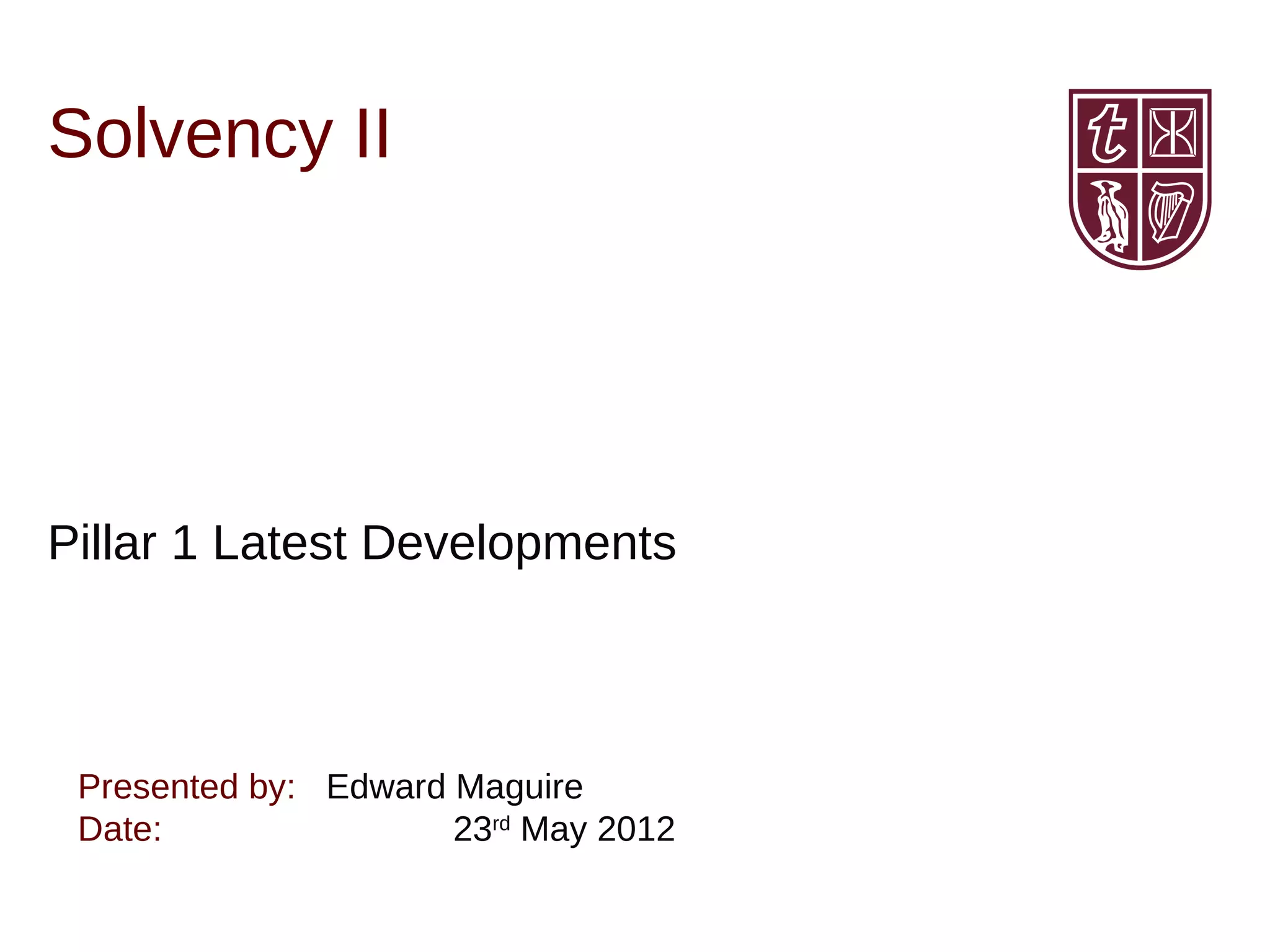The document discusses the latest developments regarding Solvency II Pillar 1, highlighting key implications from the European Parliament's report on the omnibus II directive, including changes to risk-free rates, illiquidity premiums, and various adjustments for health underwriting risks. Key topics include new capital requirements for counterparty default risk, symmetric adjustment mechanisms for spread risk, and eligibility criteria for matching adjustments in life insurance obligations. Additionally, it outlines transitional measures for third country equivalence and reviews to be conducted post-implementation of Solvency II.