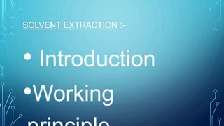 Solvent extraction is a separation process that uses immiscible solvents to transfer a solute from an aqueous solution to an organic solution. It relies on the differential solubility of compounds in two different immiscible solvents. Key aspects of solvent extraction include the Nernst distribution law, which states that the concentration ratio of a solute between the two solvents is constant at equilibrium. Solvent extraction methods include simple, multiple, continuous, and countercurrent extraction. It has various applications such as extracting uranium and plutonium from nuclear waste, separating metal ions, and recovering heat-sensitive compounds, antibiotics, and proteins.