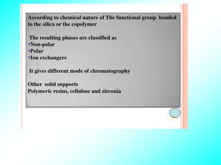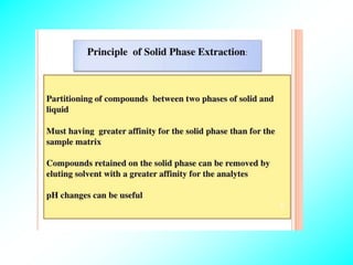 This document discusses solvent extraction, which is a versatile separation method used in analytical chemistry. It can be used to separate, purify, enrich, and analyze both tracer and macro amounts of metal ions. The key principles discussed include the phase rule, which describes solvent extraction as a two-phase system, and the Nernst distribution law, which defines the partition or distribution coefficient. Different types of extraction systems are classified, including chelate extraction involving complex formation, extraction by solvation, and ion-pair formation. Factors that affect metal complex stability such as ligand basicity and ring size are also outlined.