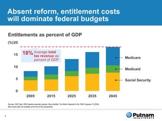 This document discusses challenges facing Americans in retirement planning and proposes solutions to help ensure adequate lifetime income. It notes that entitlement costs will rise significantly, replacement rates from Social Security are declining, and many lack workplace retirement plans, leaving a growing gap in assured retirement income. While defined contribution savings plans have grown substantially, risks like market volatility and inflation still threaten to erode savings. The document proposes new retirement plan designs that incorporate guaranteed lifetime income options and advice, and move beyond just asset accumulation to address distribution challenges in retirement.