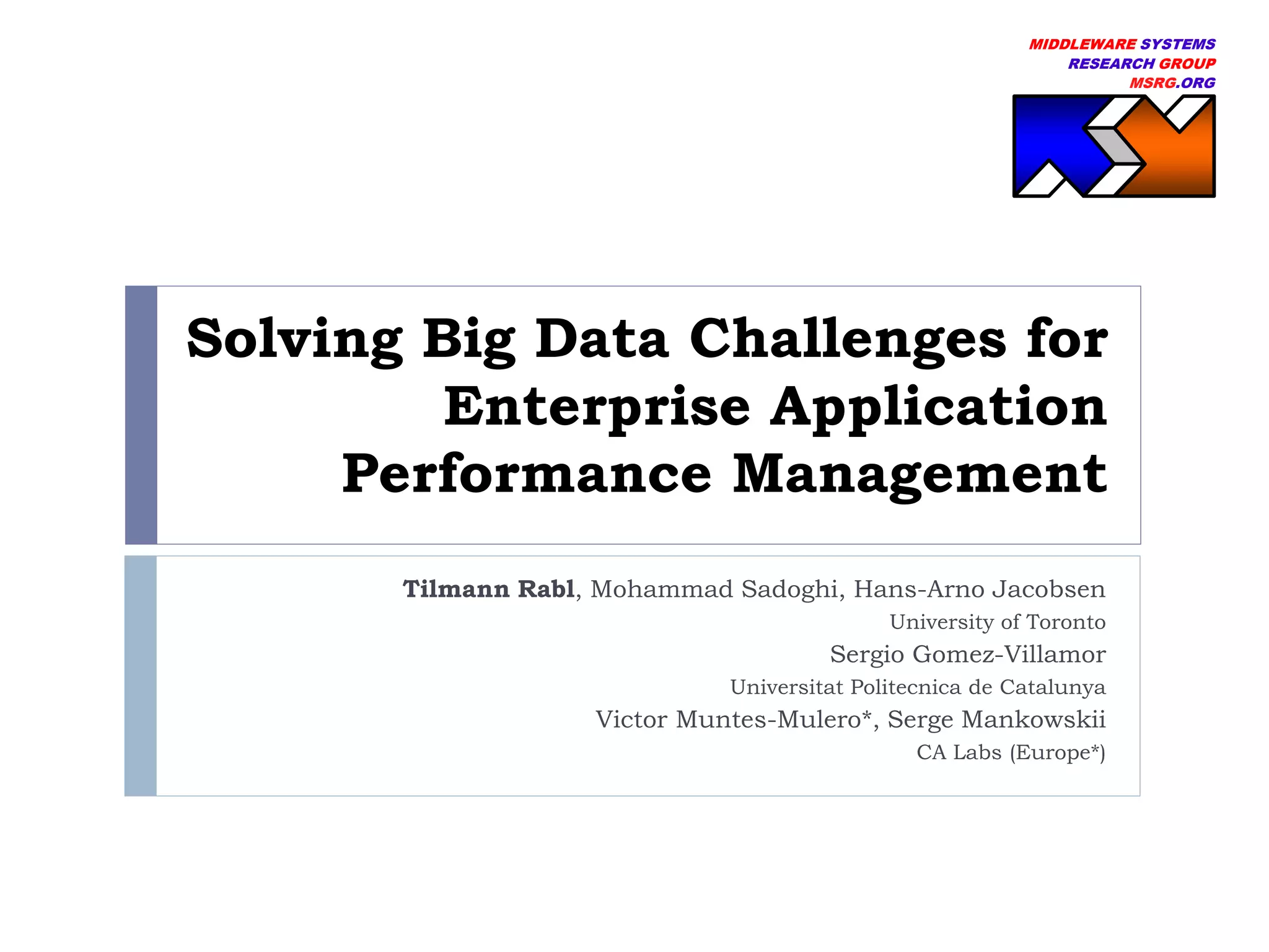 The document discusses research conducted by the Middleware Systems Research Group on application performance management (APM) for big data challenges, detailing benchmarks and results from various systems like Cassandra, HBase, and MySQL. The benchmarks indicate specific performance metrics regarding throughput and latency across different workloads, illustrating how systems behave under load and their scalability. Conclusions drawn highlight that while Cassandra meets many APM workload requirements, further enhancements are needed to ensure reliable performance in enterprise environments.