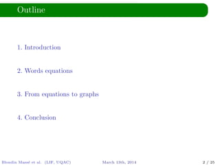 The document discusses solving equations based on words, utilizing morphisms and antimorphisms within the context of language and automata theory. It introduces concepts like distinct squares conjecture, symbolic expressions, and ways assignments extend to different expressions. The authors highlight the decidability of the problem and mention existing tools that address string constraints but do not handle morphisms and antimorphisms.
