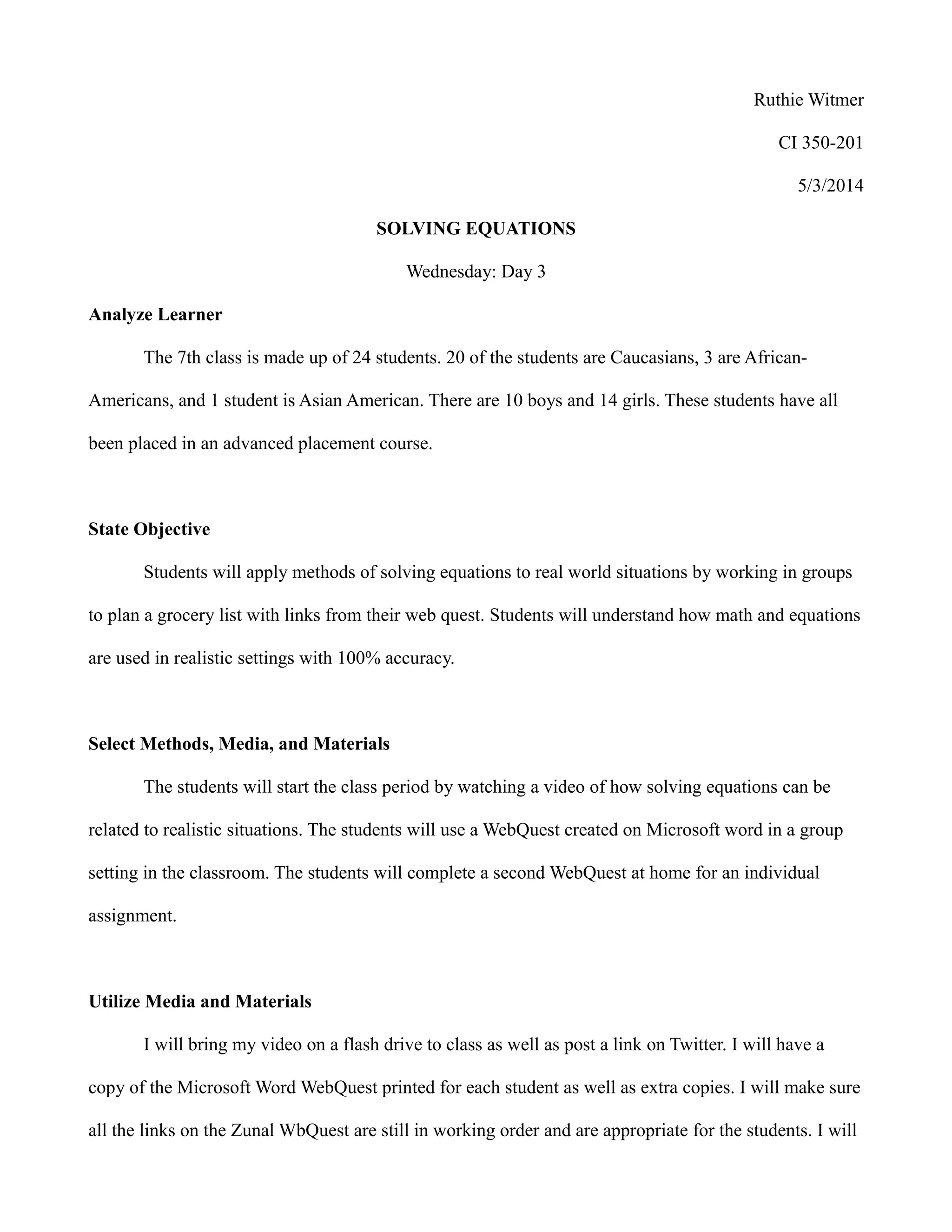 The teacher plans a lesson to teach students how to solve equations through real world examples. Students will watch a video about using equations in realistic situations. Then they will work in groups using a WebQuest to plan a grocery list. Later, students will complete a similar individual WebQuest for homework. The teacher will provide materials and ensure all students can participate, either during class or by giving extra time to those without internet access. Students will be evaluated on their participation, accuracy, and work from both the group and individual WebQuest assignments.