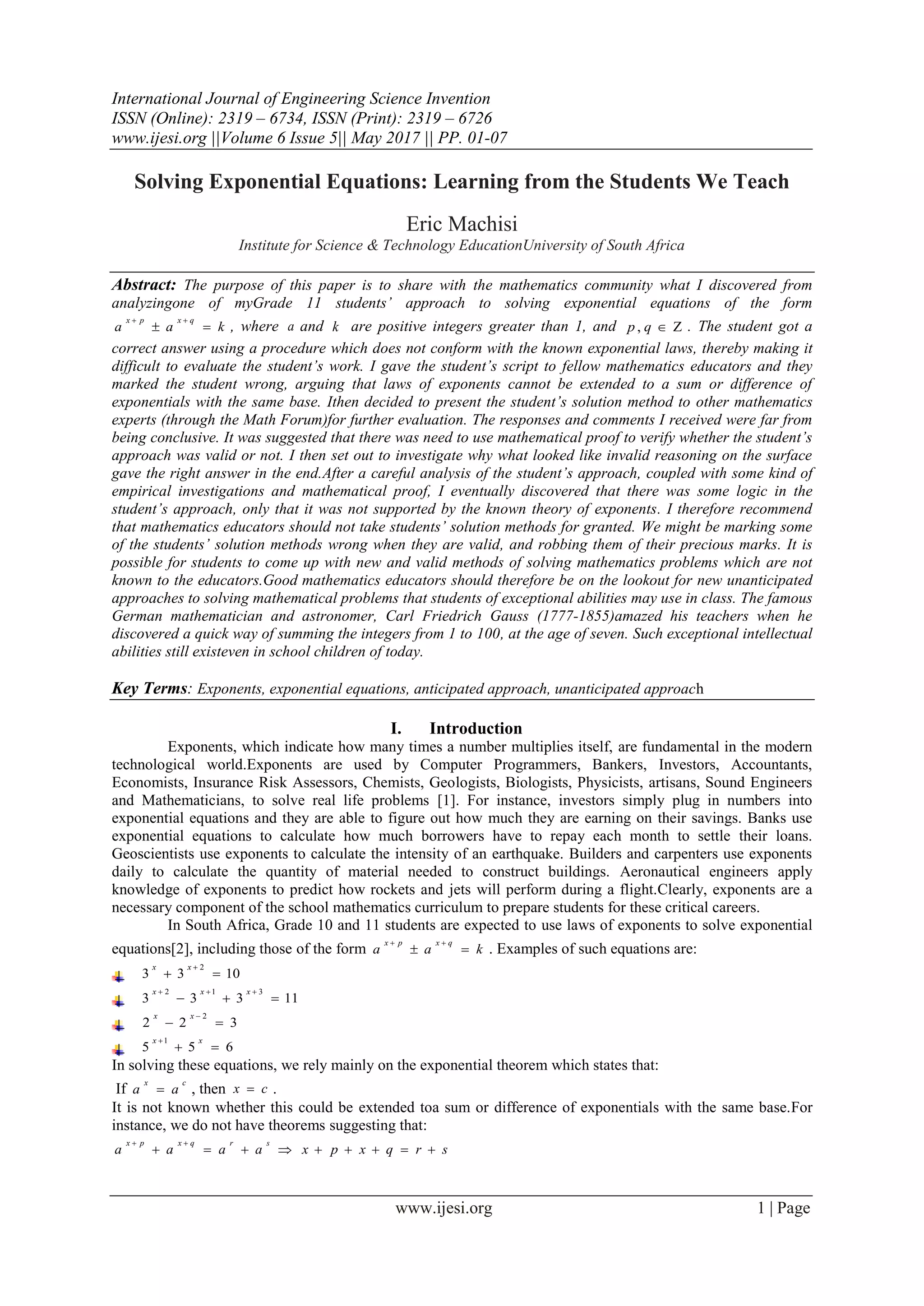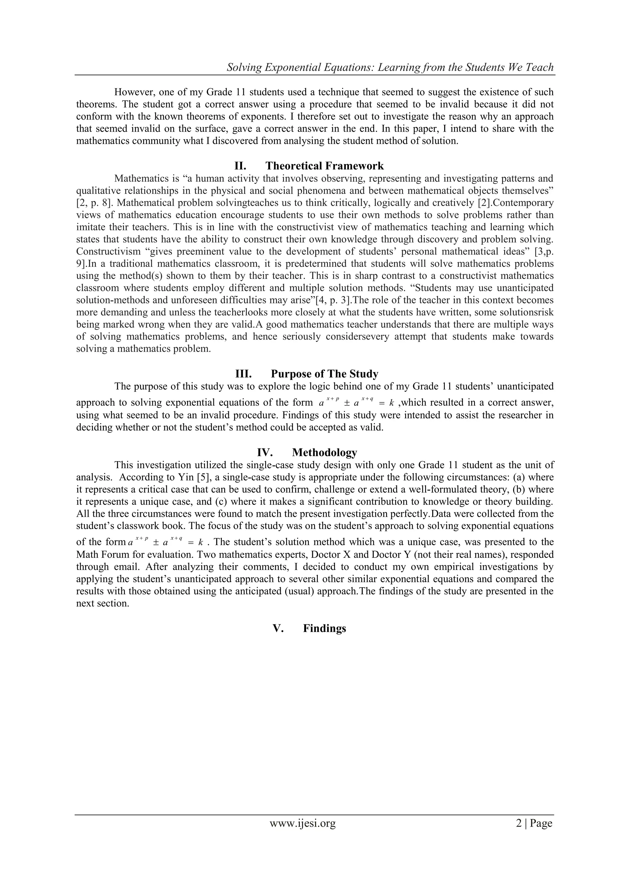 This paper examines a grade 11 student's unconventional method for solving exponential equations that produced correct answers despite not conforming to established mathematical laws. The author, after analysis and empirical investigation, concludes that the student's approach contains valid reasoning which may not be recognized by traditional teaching. It urges mathematics educators to be open to unique student methods, as they may reveal new insights and valid solutions that challenge existing frameworks.