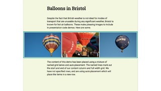 The document discusses layout solutions using CSS Grid, flexbox, and traditional methods, addressing when to use each for one-dimensional and two-dimensional layouts. It highlights the benefits of CSS Grid as a native solution offering precise control without manual sizing of grid items. Additionally, it introduces advanced topics such as grid-template-areas, subgrids, and auto-placement techniques for creating complex layouts.