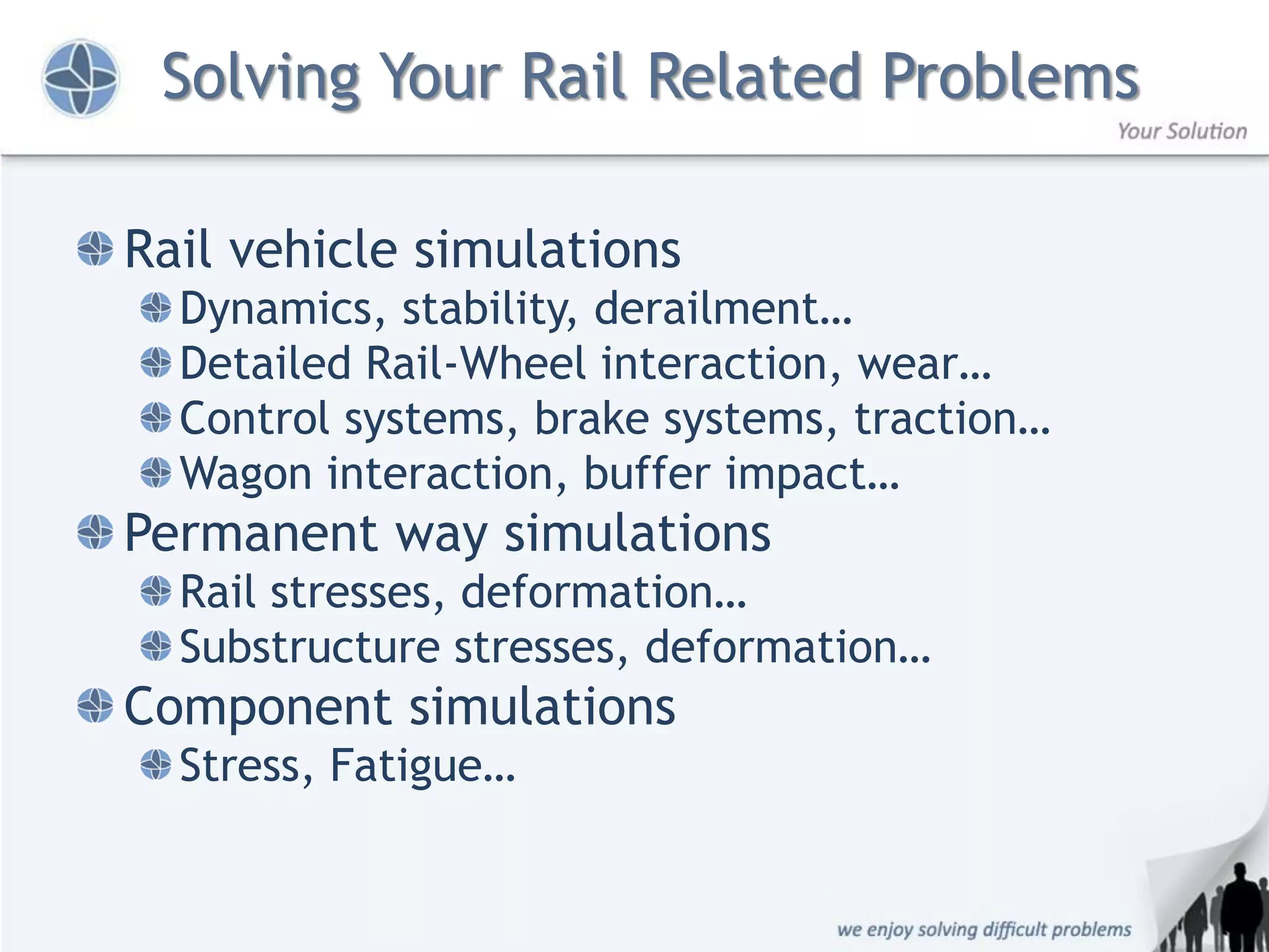 The document outlines advanced solutions for railway engineering through virtual prototyping, simulation, and integrated technology for various rail vehicle dynamics issues such as stability, braking, and wheel-rail interaction. It highlights case studies demonstrating the successful application of these technologies by major railway organizations to optimize designs, improve safety, and reduce costs. Esteq is introduced as a provider of engineering solutions, leveraging specialized tools and expertise to serve clients in the railway sector.