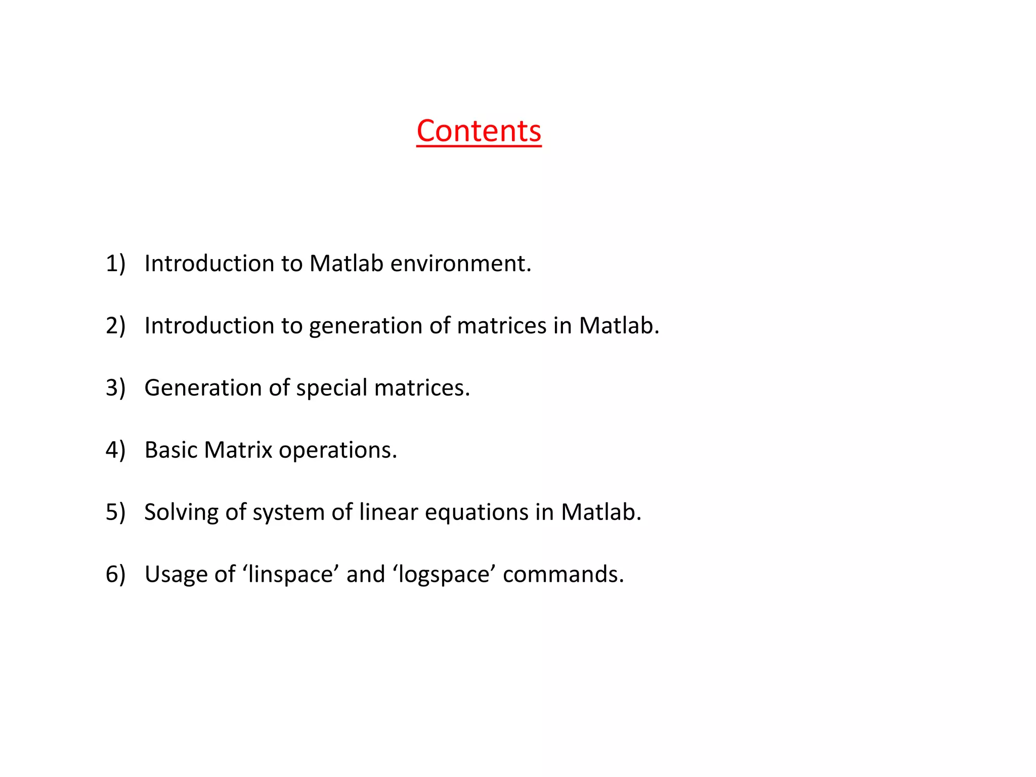 This document provides an overview of solving simultaneous linear equations in MATLAB. It introduces MATLAB commands and functions for matrix generation and operations, including generating row and column matrices, extracting and assigning matrix elements, and generating special matrices. It also covers solving systems of linear equations in MATLAB using inverse and left division methods and uses the linspace and logspace functions to generate spaced vectors. Quizzes are included to test comprehension.