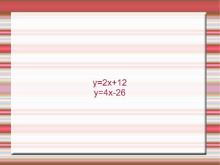 The document describes solving a system of two equations with two unknowns, x and y, using substitution. The two equations are y=2x+12 and y=4x-26. By substituting the first equation into the second, the equations are combined into one equation in terms of x alone. Solving this new equation gives x=19. Plugging 19 back into the original equations verifies the solution is x=19, y=50.