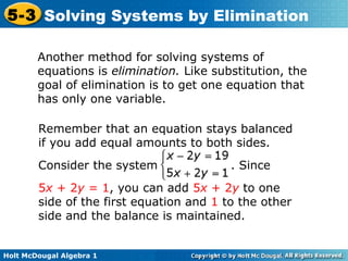 The document teaches how to solve systems of linear equations in two variables using the elimination method. It provides step-by-step examples, including aligning like terms, eliminating a variable, solving for the other variable, and checking the solution. The document also discusses methods for achieving opposite coefficients to facilitate elimination.