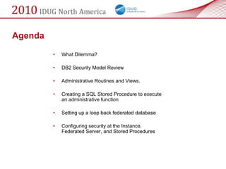 The document discusses the challenges of DB2 database administration, particularly the need to provide users with the authority to perform tasks without granting full DBA privileges. It reviews DB2's security model, detailing various administrative routines and authority levels, as well as techniques for managing permissions in a granular manner. Additionally, it covers the setup of federated databases to integrate multiple data sources while maintaining independence.