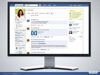 The document outlines the development and impact of Edmodo, an educational platform that leverages big data to address the education crisis. It highlights key milestones from its launch in September 2008 to significant user growth and engagement metrics, noting the expansion of its professional development features and global reach. Edmodo has facilitated collaboration among educators and students, processing billions of actions and fostering a vibrant online learning community.
