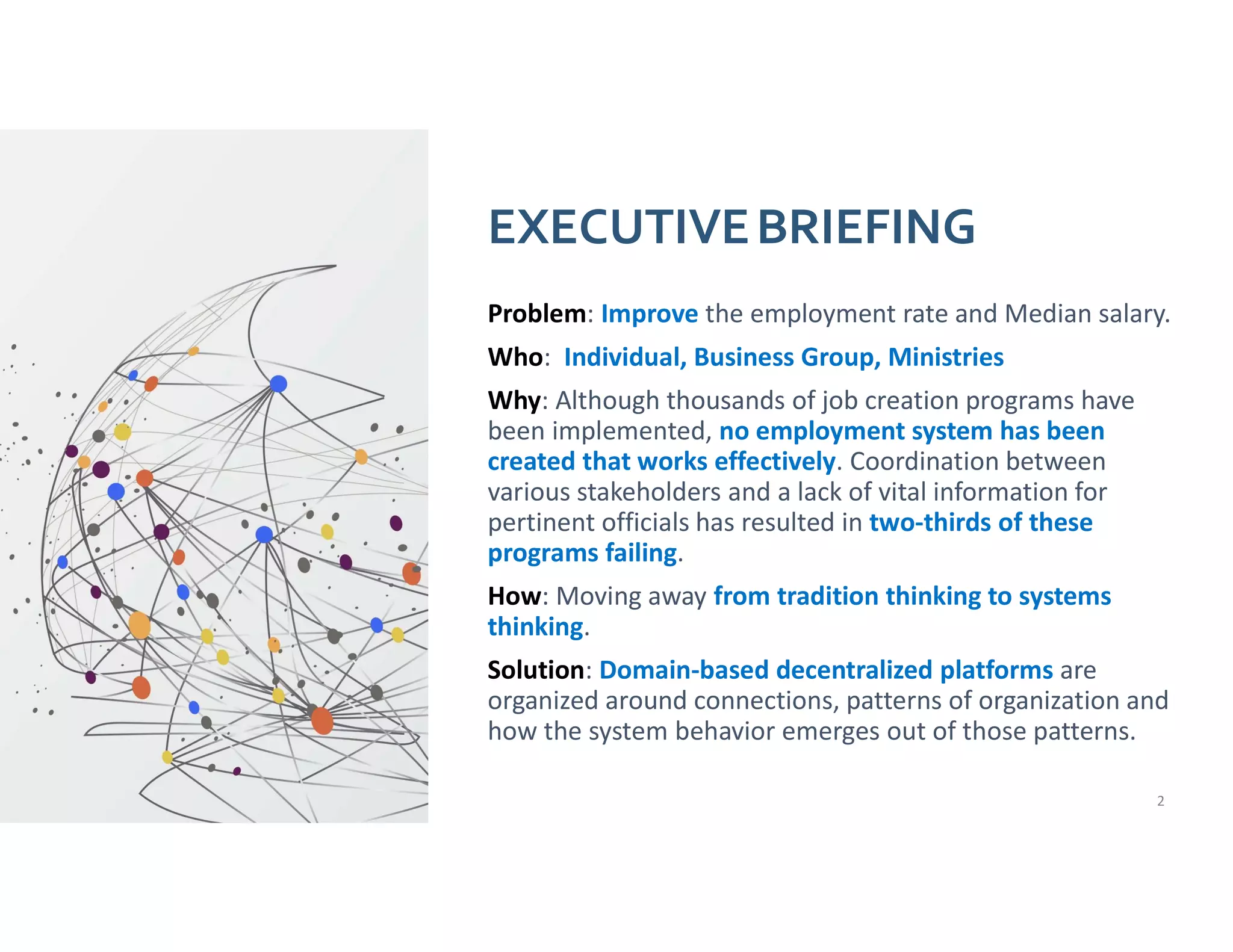This document discusses improving employment rates and median salaries through systems thinking. It identifies several problems with the current employment system including a narrow social safety net, weak information flow, and social norms that discourage entrepreneurship. The document proposes developing a decentralized platform to map the employment system, design hypotheses to address leverage points, and test solutions. A roadmap is outlined to first collaborate with stakeholders, develop system maps, design hypotheses and metrics, conduct pilot tests of hypotheses, and continually improve the platform. The goal is to create a system that provides dignity, choice and purpose for people.