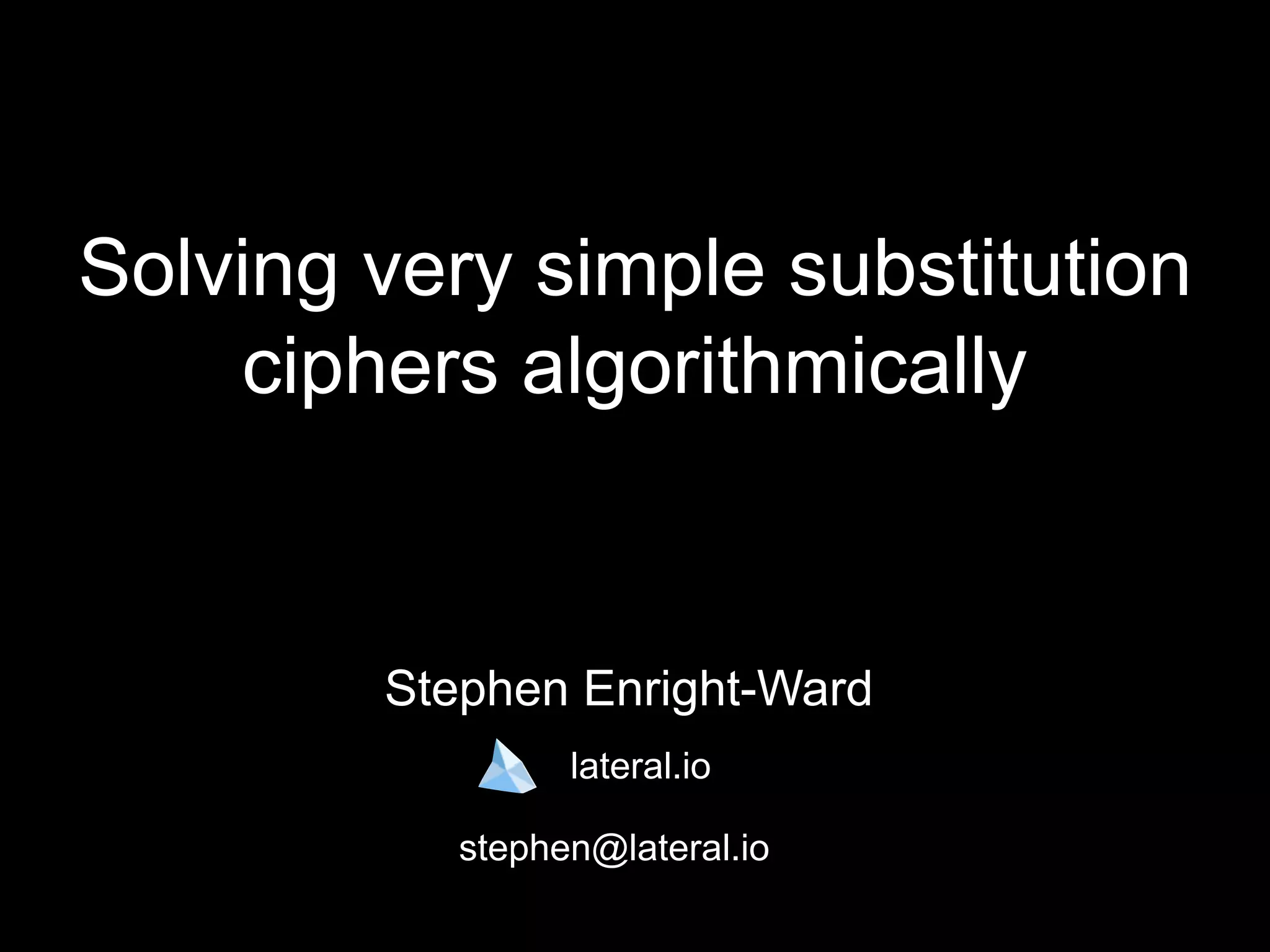 The document discusses solving simple substitution ciphers algorithmically, highlighting the challenge of decrypting historical texts like the Voynich manuscript. It introduces mono-alphabetic substitution ciphers and outlines methods for encryption and decryption involving fixed letter replacements. The content serves primarily as an educational overview rather than original research.