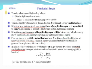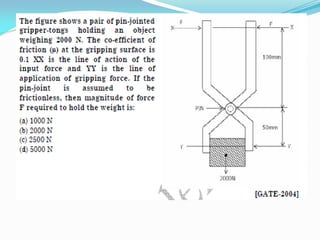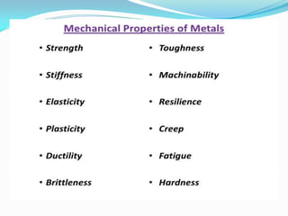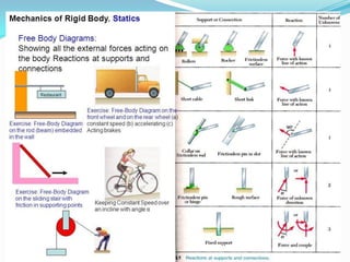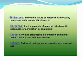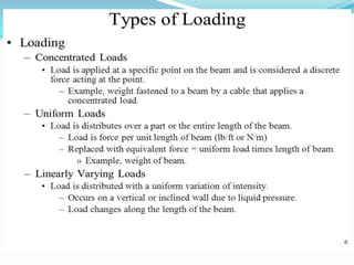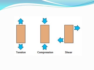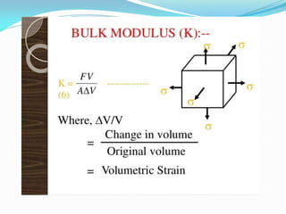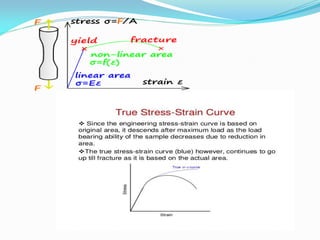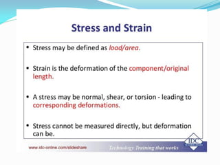 This document provides an introduction to strength of materials (SOM). It defines key terms like strength, stiffness, stability, and durability. It discusses the basic problem in SOM as developing methods to design structural elements that consider strength, stiffness, stability, and economy. It also outlines the main hypotheses in SOM, including the material being continuous, homogeneous, and isotropic. It then discusses different types of stresses like tensile, compressive, and shear stresses. It provides stress-strain curves for ductile materials and defines modulus of elasticity. Examples of calculating stresses and strains in structural elements are also provided.